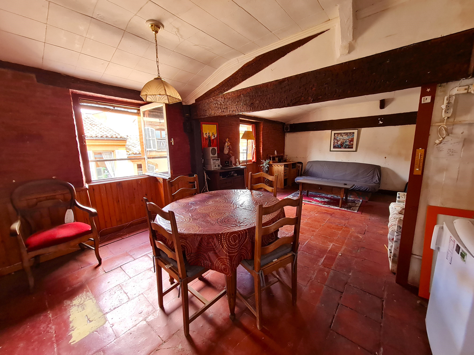 Situé entre la plce du Capitole et la place Saint-Sernin, il bénéficie d'un séjour lumineux donnant sur une petite cuisine, avec poutre apparente et tomette, et espace de rangement.