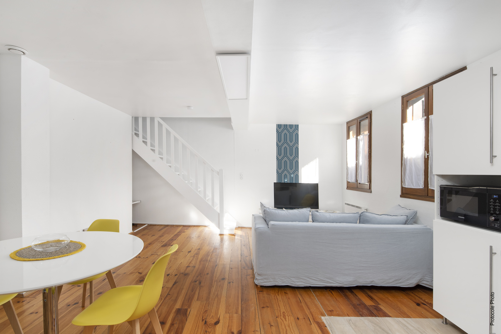 TOULOUSE - RUE DU TAUR - - Entre la Place du Capitole et la basilique Saint-Sernin, venez découvrir ce charmant T2 en duplex et dernier étage entièrement refait à neuf avec de belles prestations. Il se compose au premier niveau d'une pièce de vie avec cuisine ouverte entièrement aménagée et équipée. Au second niveau, il propose une chambre au calme avec salle d'eau. Possibilité d'acquérir le logement meublé. A visiter sans tarder.